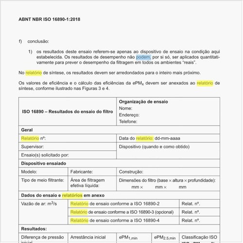 Resposta conforme a norma NBRISO16890-1 de 10/2018