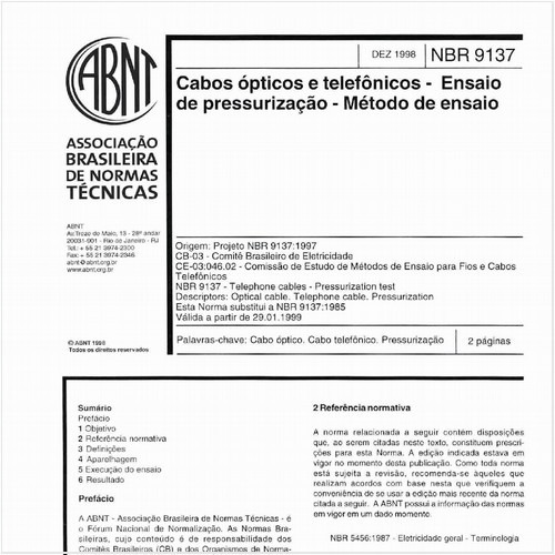Esta Norma estabelece o método de ensaio de tensão elétrica aplicada em fi os e cabos para telecomunicações. This Standard establishes the method of test for voltage in telecommunication cables and wires. ISBN: 978-85-07-03223-6