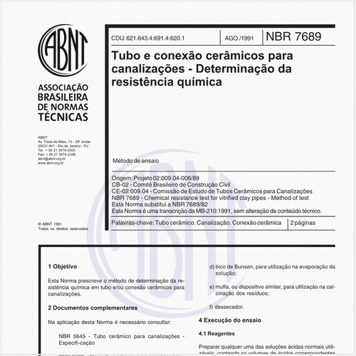 Esta Norma prescreve o método de verificação da estanqueidade e colares de tomada, destinados à execução de ligação predial, em redes distribuidoras de água com tubo de PVC rígido, conforme NBR 5647.
