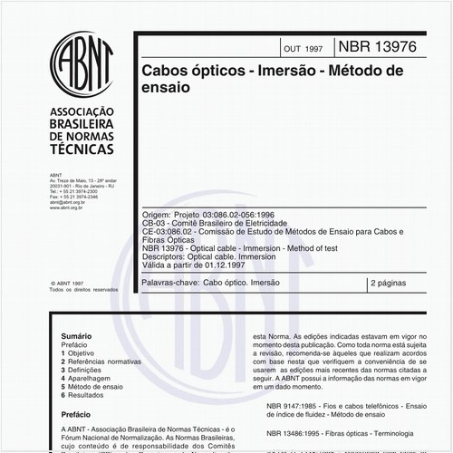 Esta Norma prescreve o método de ensaio de imersão em cabos ópticos, para a determinação das variações do índice de fluidez, da massa e de aspectos visuais do material analisado.