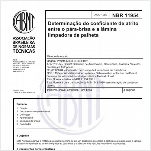 Esta Norma prescreve o método pelo qual determina-se em um dispositivo de ensaio o coeficiente de atrito entre a lâmina limpadora da palheta do sistema limpador do pára-brisa e o pára-brisa de veículos rodoviários automotores.