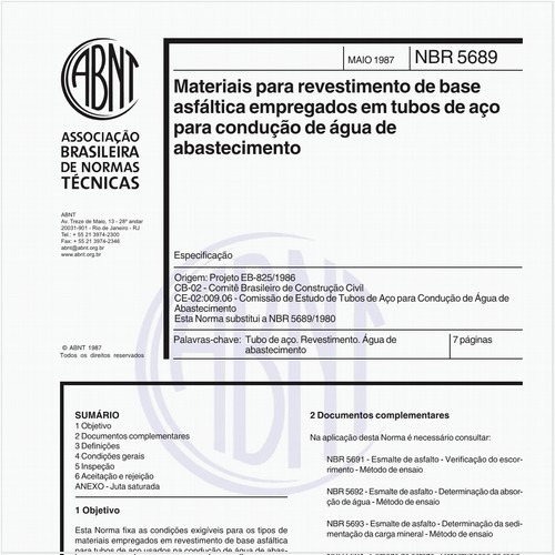 Esta Norma especifica um método para determinação da resistência à fadiga ao dobramento do cabo de aço. This Standard specifies a method for determining the bending fatigue properties of steel wire rope. ISBN: 978-85-07-04851-0