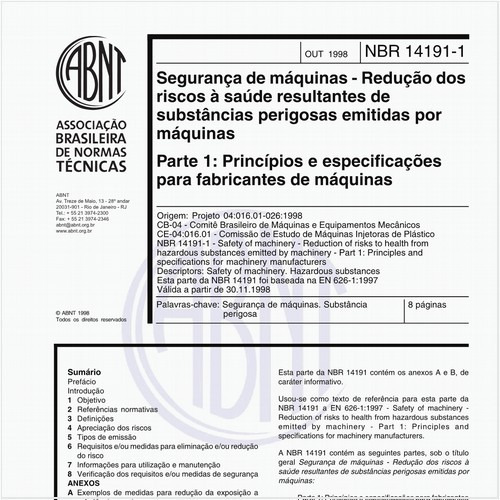 Esta parte da NBR 14191 descreve os princípios para o controle dos riscos à saúde resultantes da emissão de substâncias perigosas por máquinas.
