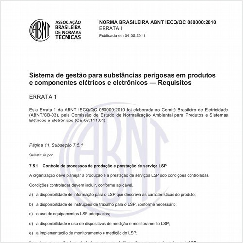 Define os requisitos para o estabelecimento dos processos para identificar e controlar a introdução de substâncias perigosas (SP) em produtos elétricos e eletrônicos. No caso de substâncias perigosas eventualmente serem introduzidas nos produtos, esta ...