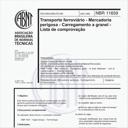 Esta Norma padroniza a lista de comprovação do carregamento a granel de mercadoria perigosa (MP) em vagão-tanque para transporte ferroviário.