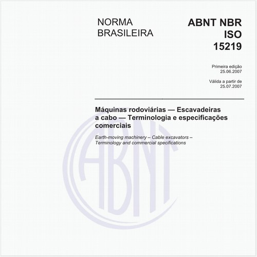 Esta Norma estabelece a terminologia e o contéudo de especificações de literatura comercial para escavadeiras a cabo autopropulsoras de rodas e esteiras e seu equipamento. Escavadeiras a cabo são utilizadas principalmente para aplicações de dragagem, e...