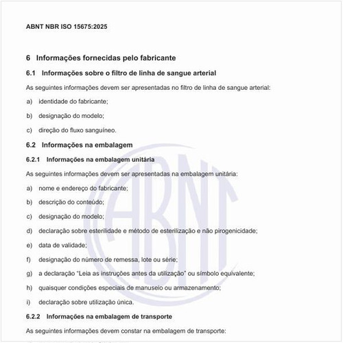 Quais as informações sobre o filtro de linha de sangue arterial que o fabricante deve fornecer?