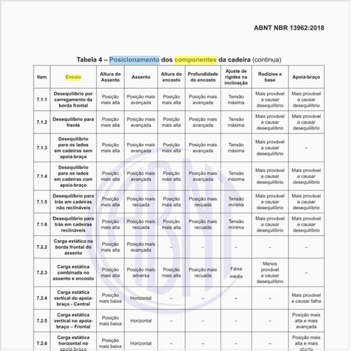 Para o ensaio, qual é o posicionamento dos componentes da cadeira?